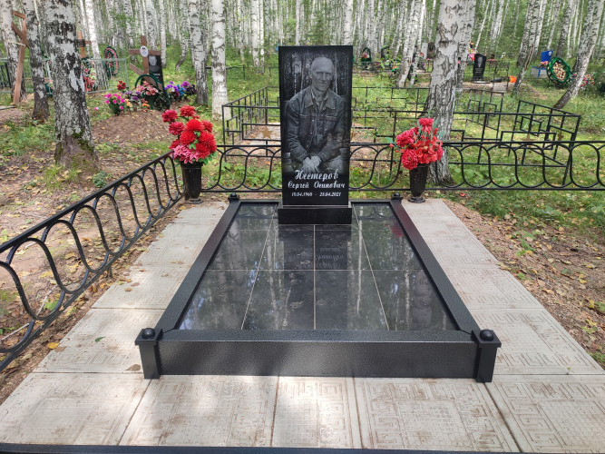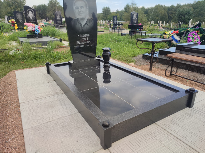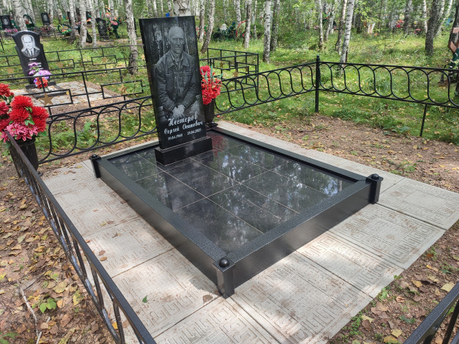 Данный вид надгробий изготавливается из бетона и плитки (долерит, габбро, гранит), простым языком: делается планировка грунта, подготовка подушки из крупного камня для заливки бетона, устанавливаются опоры (швеллер), устанавливается опалубка, заливается бетон, который обязательно хорошо армируется, после такого как бетон застынет получившуюся плиту обклеиваем плиткой из натурального камня, затираем швы, устанавливаем памятник. При соблюдении минимальных требований к технологии изготовления данного вида надгробия затраченное время составляет 1,5-2 месяца.