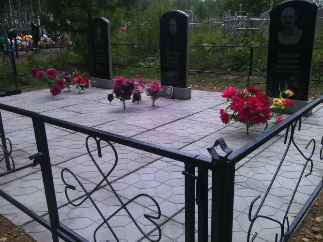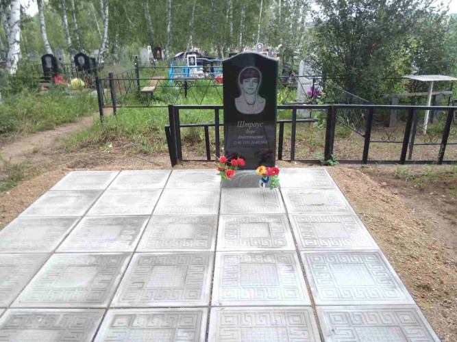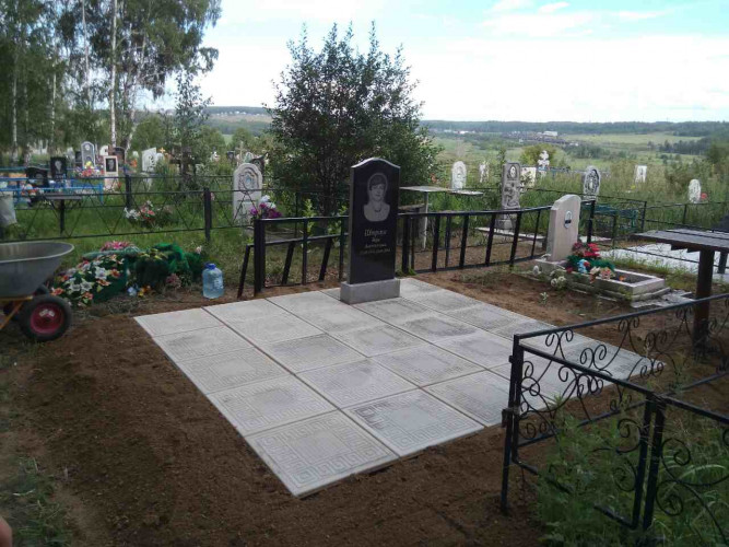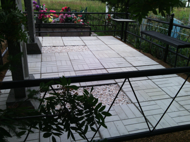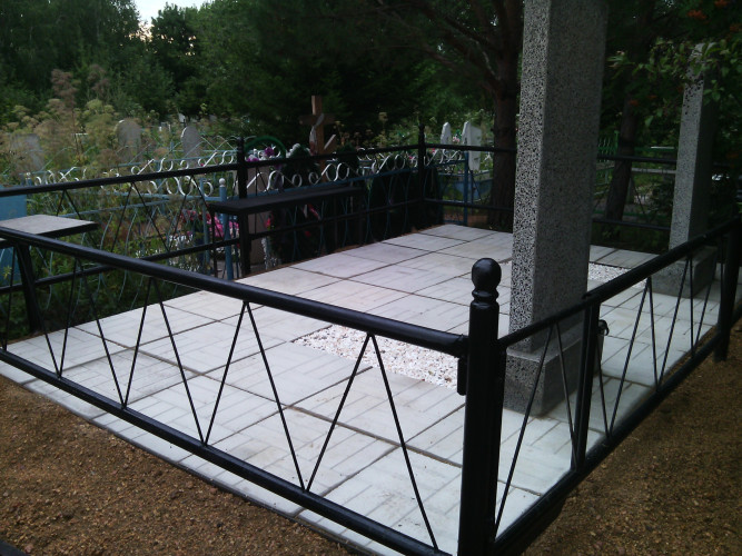 Надгробие выполнено из металлической рамки (уголок 40*40*4), сваренного так, чтобы при монтаже каждая ж.б. плитка укладывалась в свою отдельную ячейку рамки, тем самым мы уходим от проблемы проваливания плитки, подмыв талыми водами при выходе из зимы. Размер надгробия 2,5м * 2,5м. Есть несколько вариантов исполнения в зависимости от пожелания клиента: