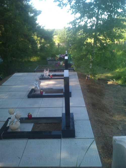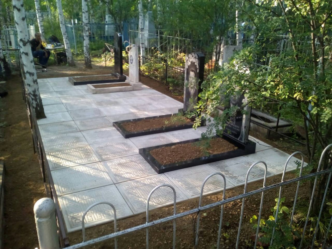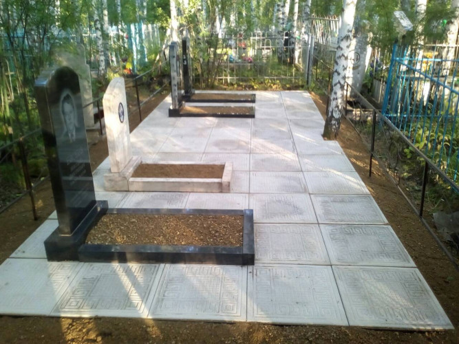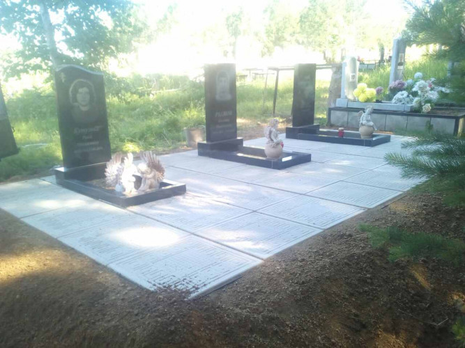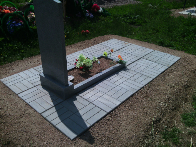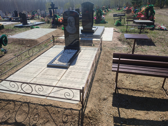 Отличие от одинарного надгробия это ширина (размер надгробия 2м * 2,5м), в данном надгробии добавляем еще один ряд плитки, где можно установить лавку, столик. Надгробие выполнено из металлической рамки (уголок 40*40*4), сваренного так, чтобы при монтаже каждая ж.б. плитка укладывалась в свою отдельную ячейку рамки, тем самым мы уходим от проблемы проваливания плитки, подмыв талыми водами при выходе из зимы: