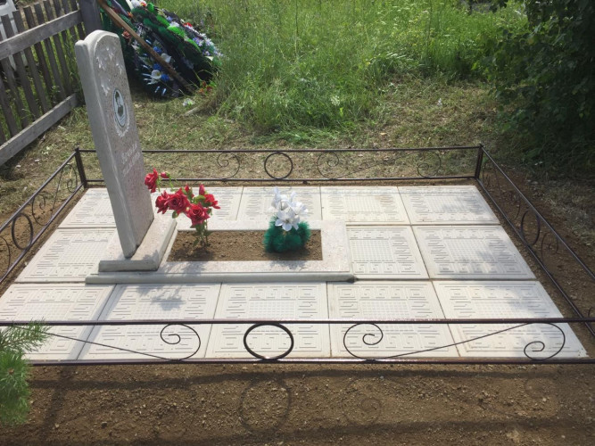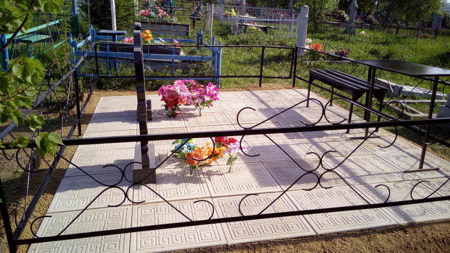 Надгробие выполнено из металлической рамки (уголок 40*40*4), сваренного так, чтобы при монтаже каждая ж.б. плитка укладывалась в свою отдельную ячейку рамки, тем самым мы уходим от проблемы проваливания плитки, подмыв талыми водами при выходе из зимы. Размер надгробия 1,5м * 2,5м, рекомендуемый размер памятника для установки на данное надгробие до 120см.